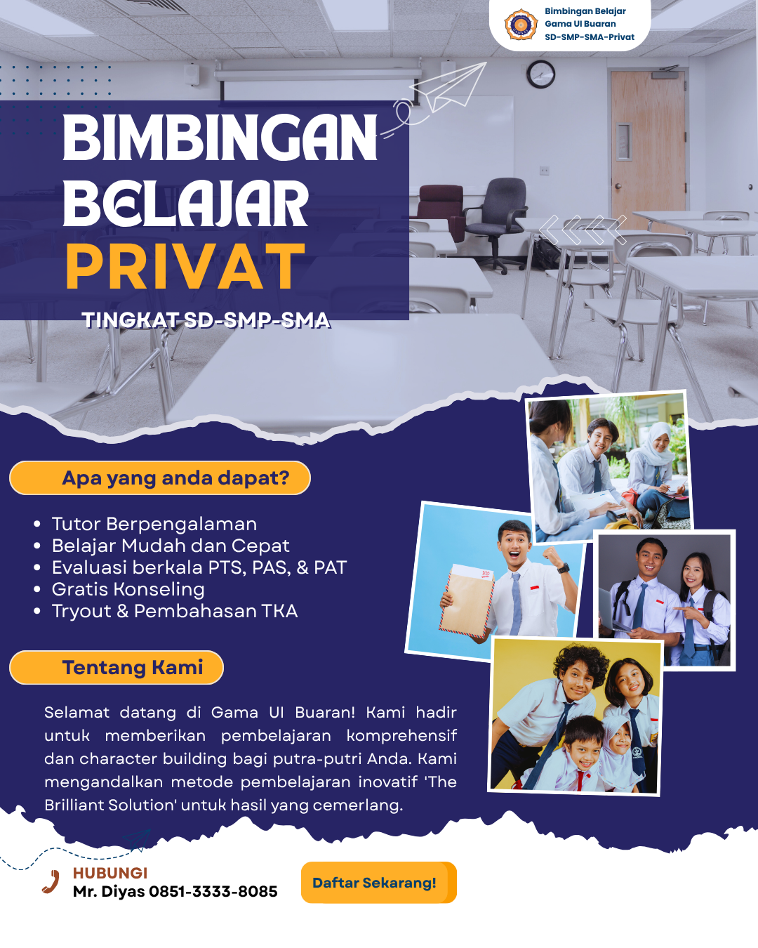 Program BIMBINGAN BELAJAR PRIVAT kami (SD-SMP-SMA) dirancang khusus untuk memberikan perhatian penuh dan metode yang tepat bagi anak Anda.